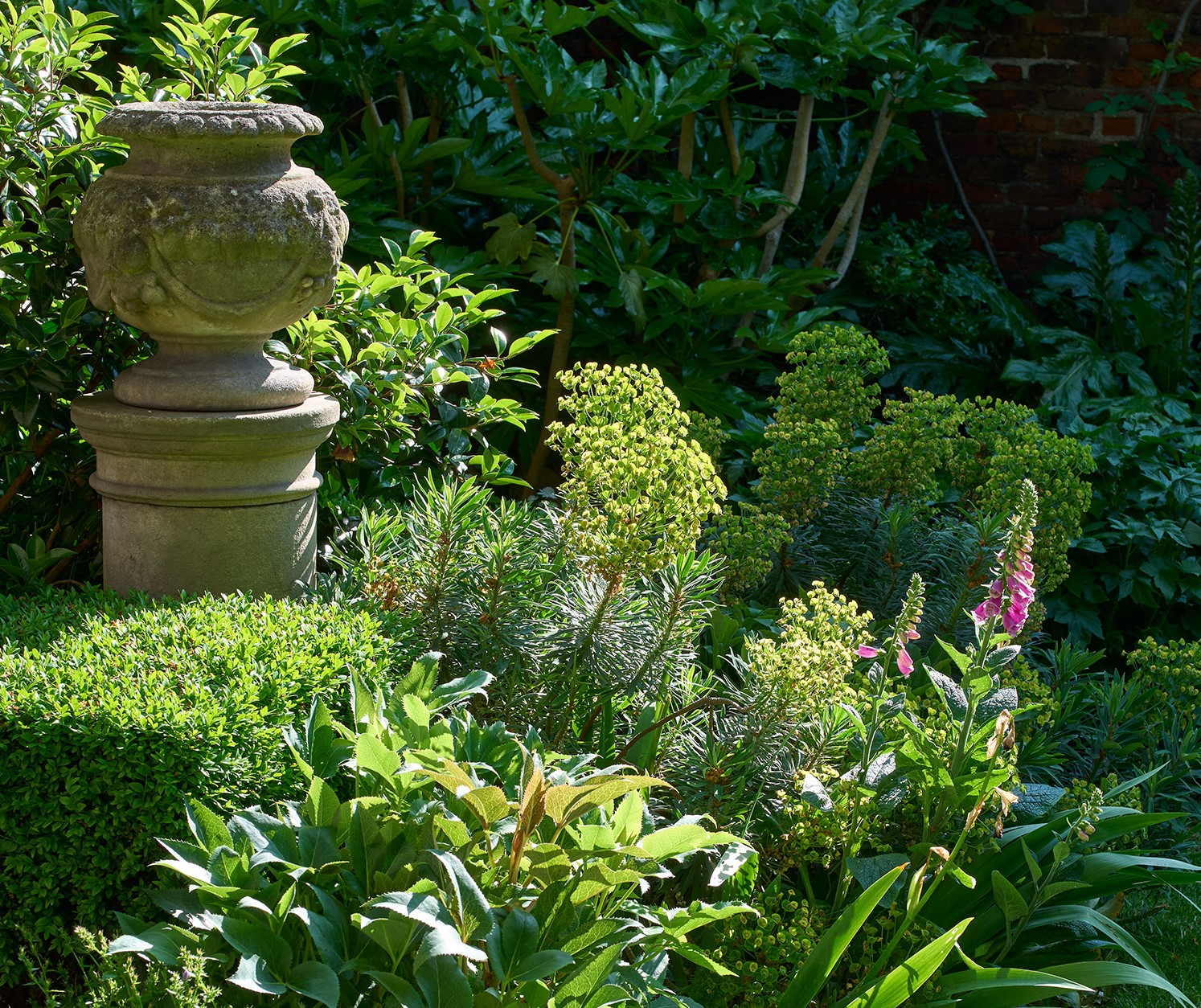 a stone urn and plants in the Norfolk Garden at the Charterhouse